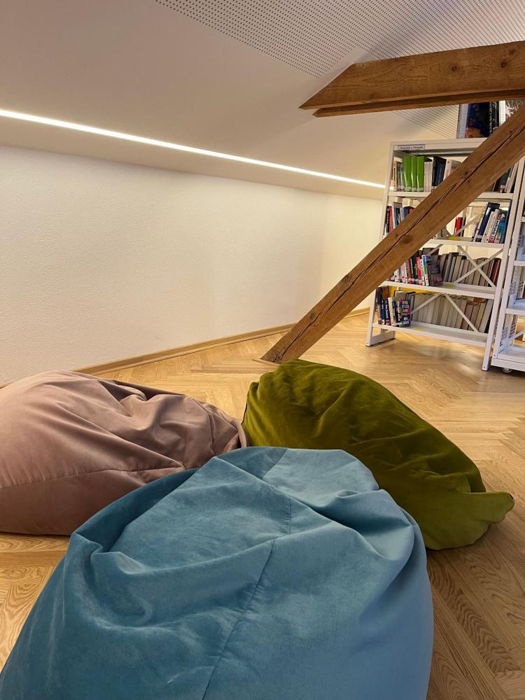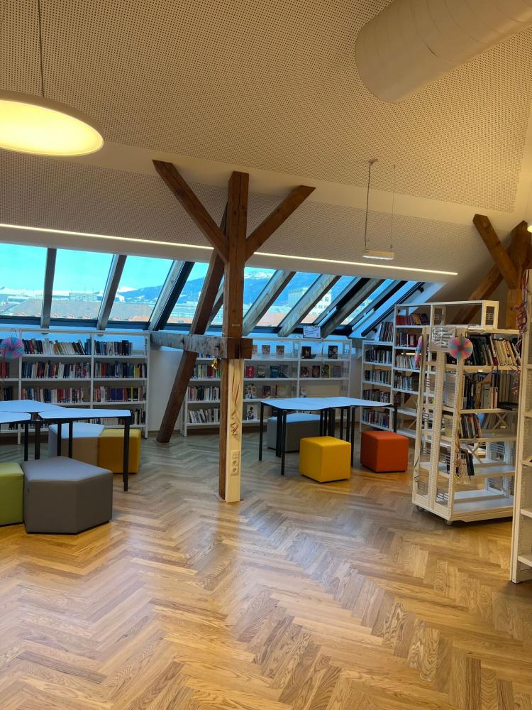 Unsere neue, moderne Schulbibliothek beherbergt über 5000 Medien, darunter Bücher, DVDs und Zeitschriften (auch in Englisch, Französisch, Italienisch, Spanisch). Auch Arbeitsplätze stehen zur Verfügung, sodass sie zu einem Lern- und Rückzugsort für die ganze Schulgemeinschaft wird. Wir bieten auch spezielle Angebote für Schüler:innen, die eine ABA schreiben, an und beraten euch gerne.