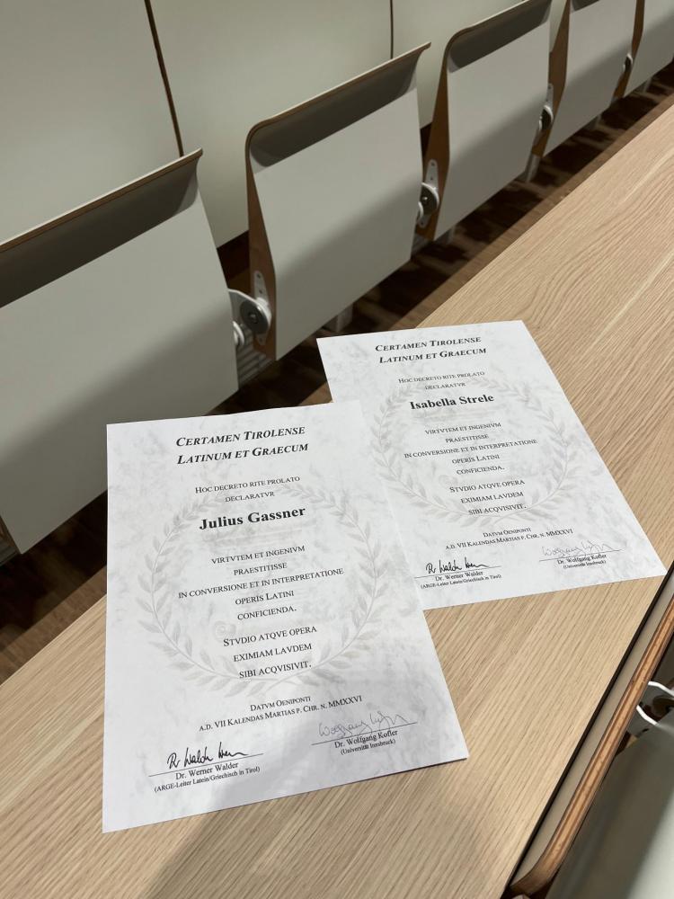 Der Certamen Tirolense Latinum et Graecum fand am 23. Februar im Agnes-Heller-Haus an der Universität Innsbruck statt. Julius Gassner (7B) und Isabella Strele (7A) stellten bei diesem tollen Wettbewerb ihr ganzes Können eindrucksvoll unter Beweis und zeigten ihre Liebe zur lateinischen Sprache.