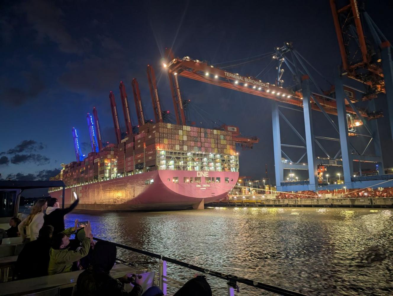 Der Abend des ersten Tages ging mit einer Lichterfahrt durch den Hamburger Hafen zu Ende. Der Kapitän des Schiffes begrüßte uns und andere Schulklassen sehr „freundlich“ und freute sich sichtlich auf die gemeinsame Fahrt. Besonders beeindruckend waren die riesigen Container- und Kreuzfahrtschiffe.